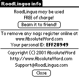 First of all thank you for trying RoadLingua - a powerful but easy-to-use dictionary shell for Palm OS compatible devices. The main features of RoadLingua are: